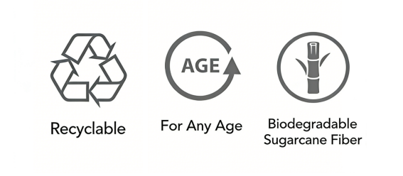 | Material | 100% natural sugarcane bagasse · Renewable, biodegradable, compostable |